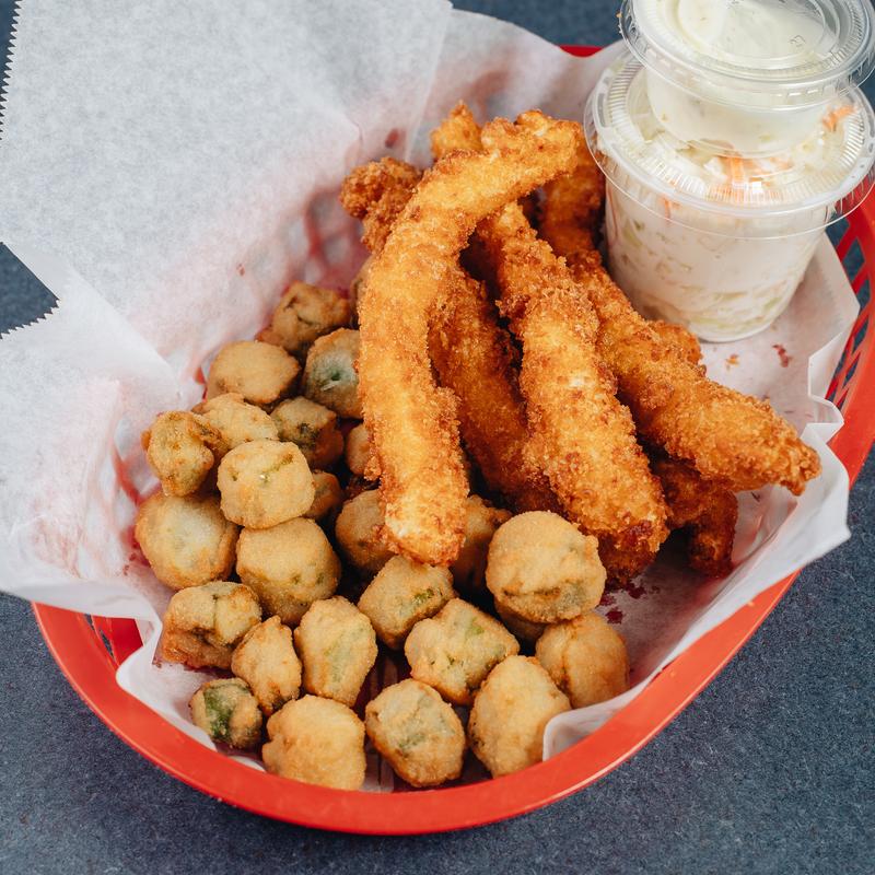 Served with house fries & coleslaw | 2 cod, 2 jumbo shrimp, 2 calamari strips, ¼ lb fried clam strips